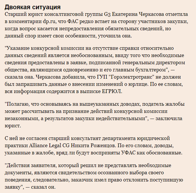 Nikita Rozhentsov, Senior Consultant, Alliance Legal CG Legal Department for business journal "Business Petersburg". The Board of the Federal Antimonopoly Service in St. Petersburg suspended state procurement of work-wear for "Gorelektrotrans". The Office received a complaint from "Ivanovo textile company". The manufacturer claims that the carrier unreasonably rejected their application, and the State Unitary Enterprise says that the company did not provide all the documents.