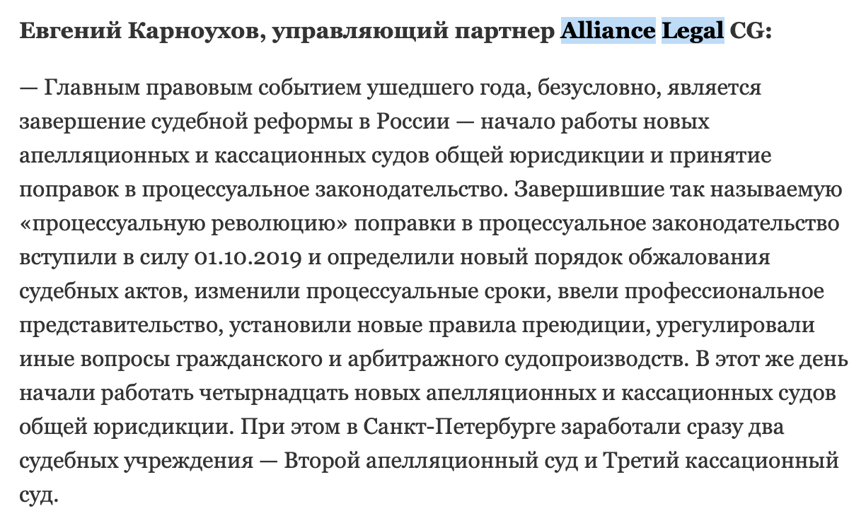 The overwhelming majority of lawyers surveyed called the ended “procedural revolution” the most significant event of the past year. However, in addition to this event, other events were named that, according to experts in the field of law, will have a serious impact on both the economic and social life of the country. Commentary by Alliance Legal CG Managing Partner Evgeny Karnoukhov for Kommersant business publication.