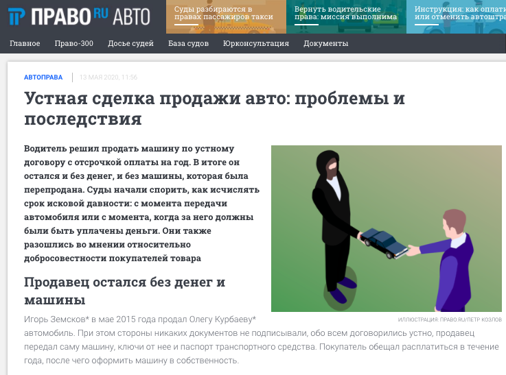 Водитель решил продать машину по устному договору с отсрочкой оплаты на год. В итоге он остался и без денег, и без машины, которая была перепродана. Суды начали спорить, как исчислять срок исковой давности: с момента передачи автомобиля или с момента, когда за него должны были быть уплачены деньги. Они также разошлись во мнении относительно добросовестности покупателей товара. Комментирует эксперт Ольга Калинченко